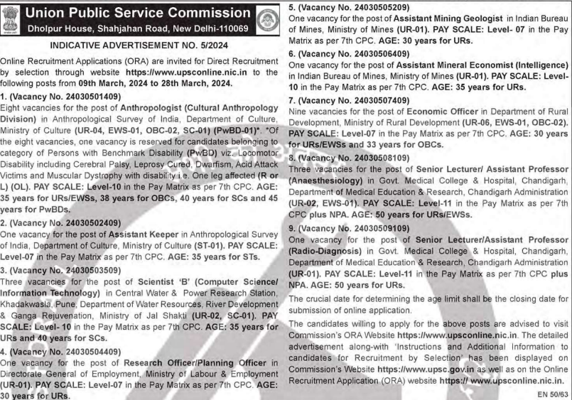 UPSC Various Vacancy Recruitment 2024: Complete Details